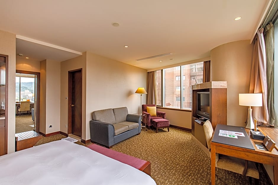 Overlooking Taipei 101 Building and Taipei City from large windows, this spacious suite features earth-toned interiors, a living room and a personal safe. Private bathroom has a bathtub and separate shower stall.
